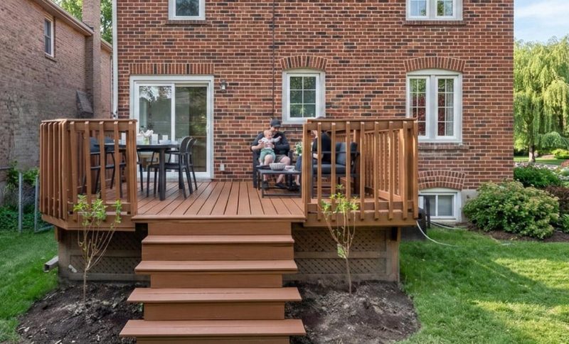Family sitting on a wooden deck behind a brick house
