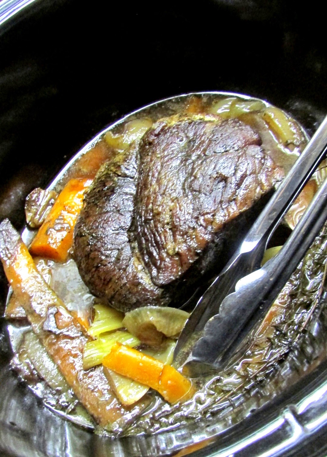 Also, because I now have a huge crockpot, I did not realize that more liquid would be mandatory for a moist roast beef too. Ack!